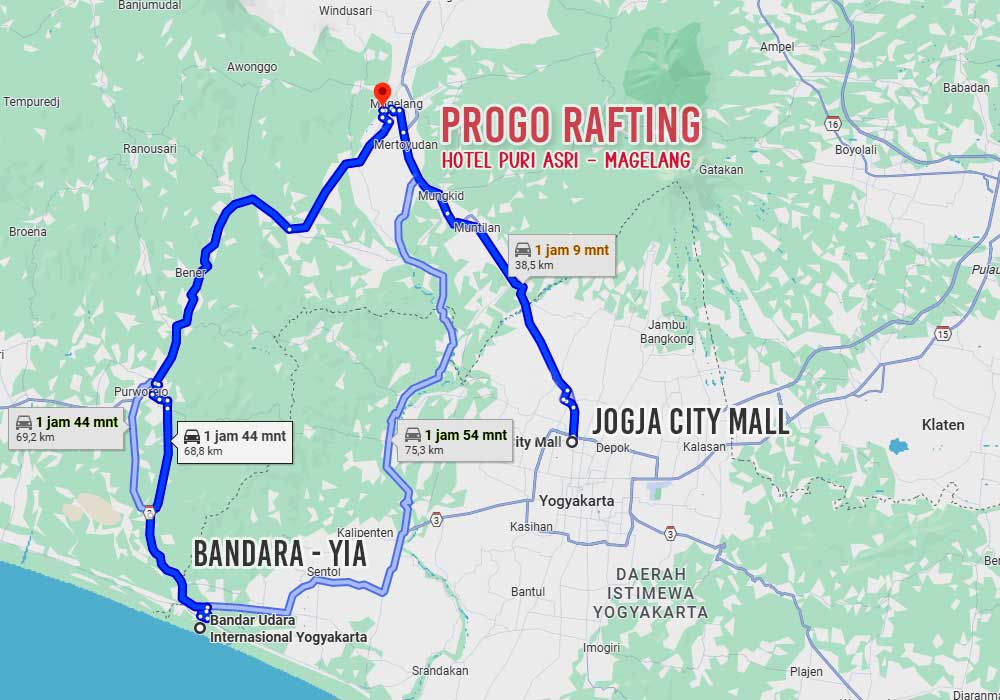 Hanya 39 km dari Jogja City Mall, Yogyakarta, PROGO RAFTING berlokasi didalam Kawasan Hotel Puri Asri dan resort Kota magelang, yang berbatasan langsung dengan TKL Ecopark atau Taman Kyai Langgeng, Hotel Sevilla, Villa Grand Artos dan hamparan luas persawahan wilayah Kabupaten Magelang.